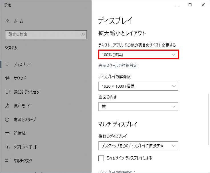 Windows 10の拡大縮小設定を100%に変更するには次の手順を実施します。